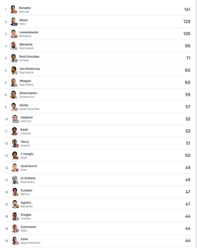 欧冠历史射手榜TOP20:姆巴佩第6,哈兰德第10,凯恩第18